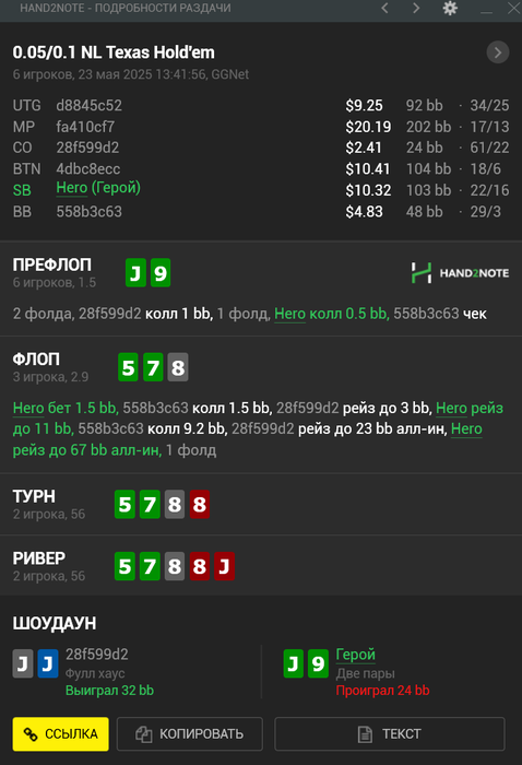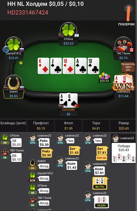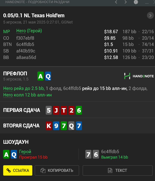 Когда-нибудь я буду плюсовым, надеюсь. БРа хватает ещё на нл10 посидеть 5-6 таких сессий, чтож, попробуем :D Почти все крупные раздачи скину. В общем за все сессии, которые конвентировал в х2н, я в минусе уже на 13$ а по EV в плюсе на 30$. хз, пока так) Тильта нет, есть просто ахуй.