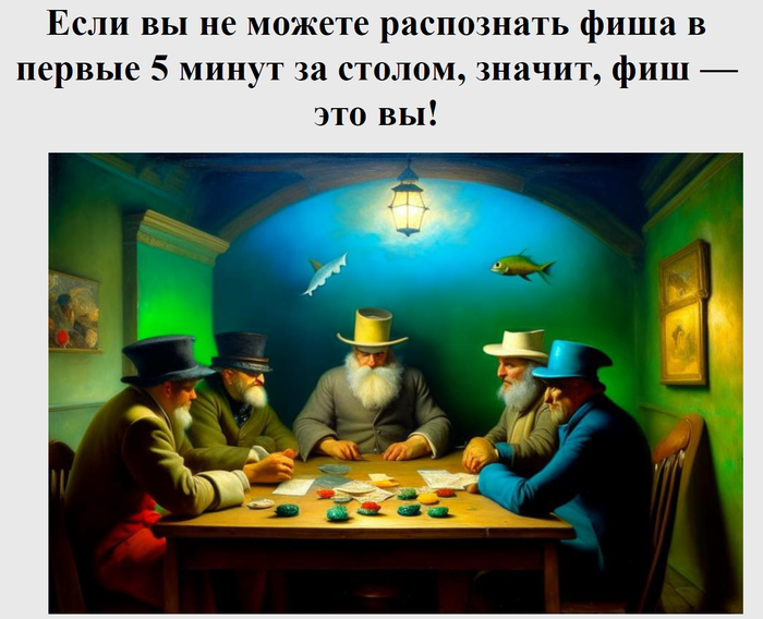 covsh, приветствую, несколько лет собираю покерные "перлы", потом начал совмещать с картинками, генерирую ИИ и подбираю максимально подходящую.