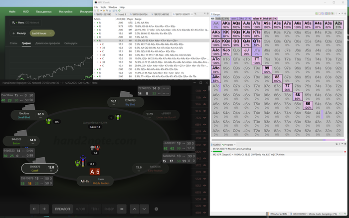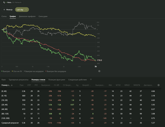 Вот ты скинул график, со статами и по ним уже очень много можно сказать о твоей игре. Посмотри отыгрыши 20бб (они не требовательный по оперативке) и менее стеках, и сравни со своей игрой. Сравни со своей игрой, задай себе вопрос после, почему ты не играешь так как предлагает кальк в тех или иных спотах.
