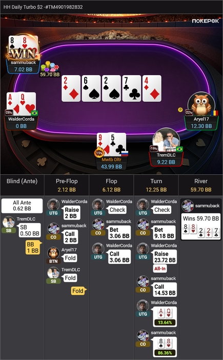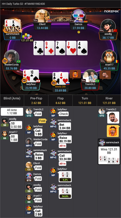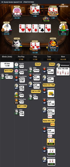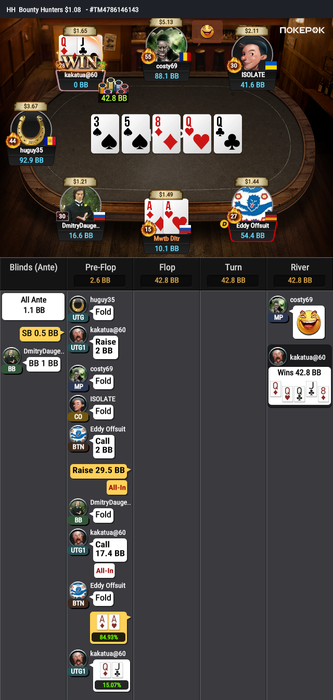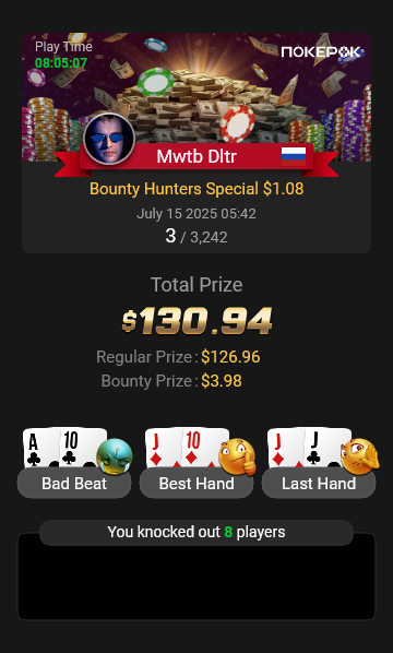 У меня все еще оставались отличные шансы на победу. Пока еще через 10 раздач я не трибетнул чипака всем стеком 11bb с карманными валетами, оппонент инста-колл AQo, и я вылетел третьим.