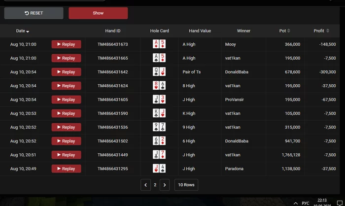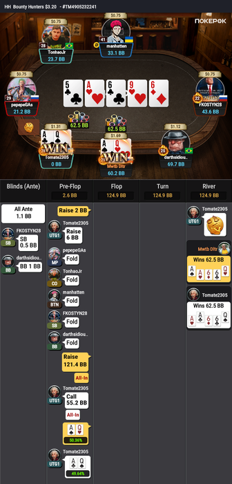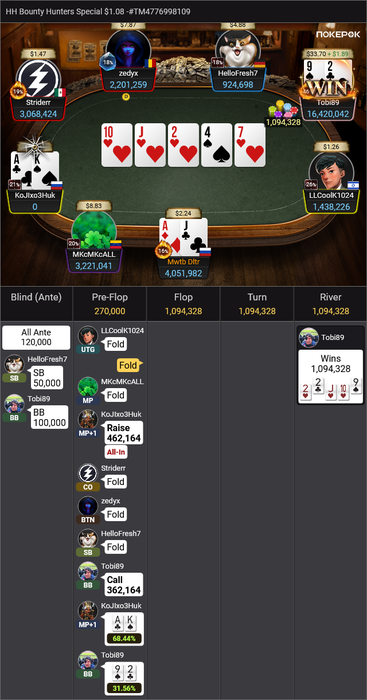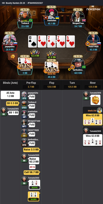 Я начал зарубаться с ним в дуэлях на правах чиплидера (все еще имел большой стек). Tomato без тени сомнения ходил во все префлоп-аллины. Но Покерок решил засейвить Tomato, дважды дал ему дележку.
