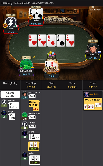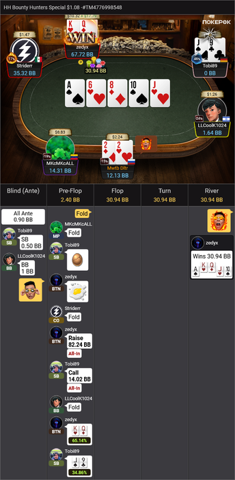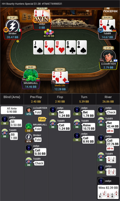 В 5-max играли очень долго. Дошло до того, что я стал самым коротышкой. Zedyx сидел спокойно, не поливал стол, хотя для этого были все возможности. И вот когда я запушил свои 4bb с JTo, он решил проснуться и заколлить, удвоив меня: