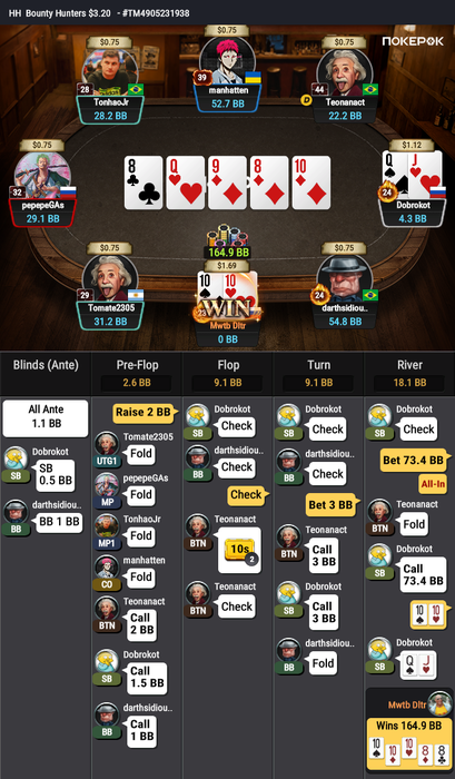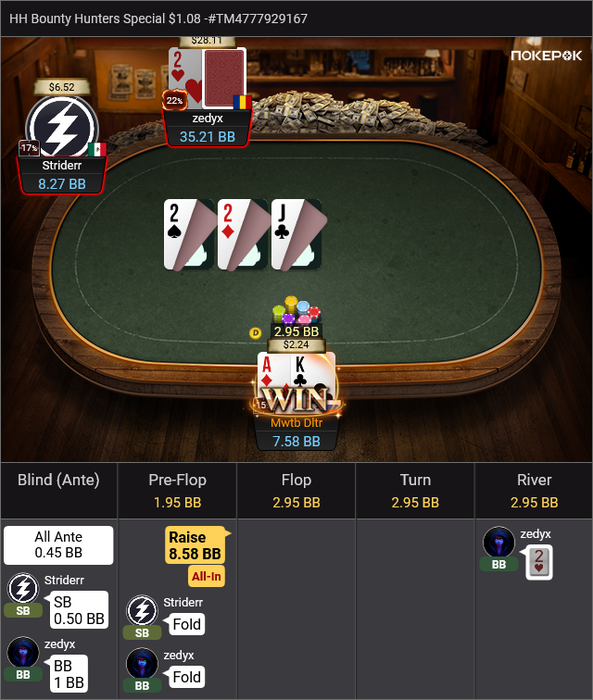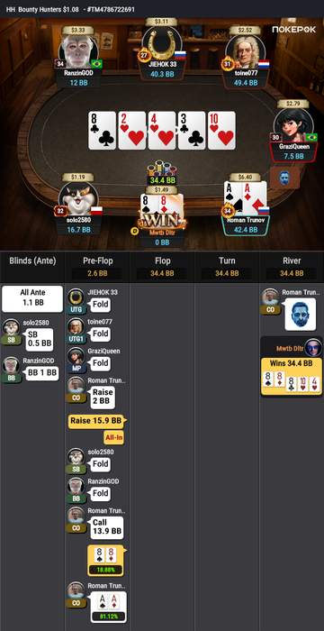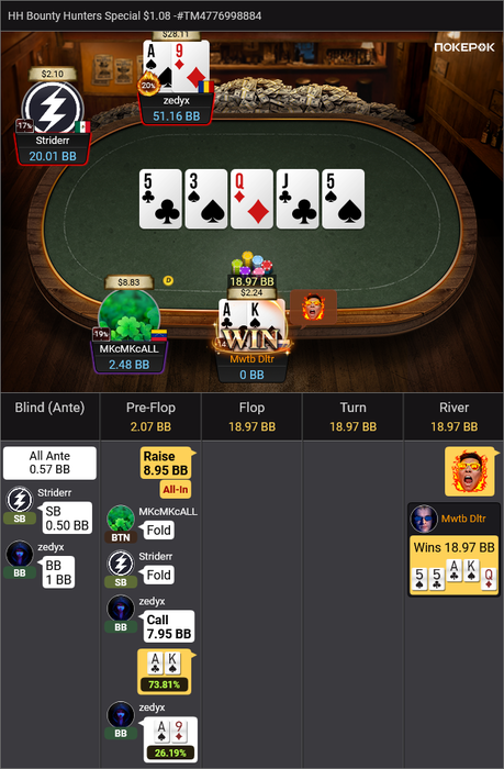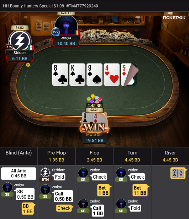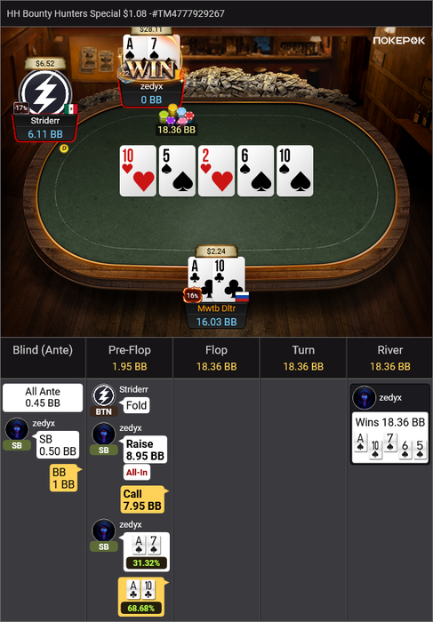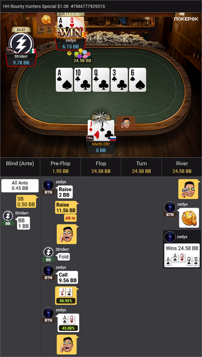 Потом zedyx в хедз-апе добил второго и взял $292 за первое место, к которому я был так близок. Поэтому нет особой радости от третьего места.