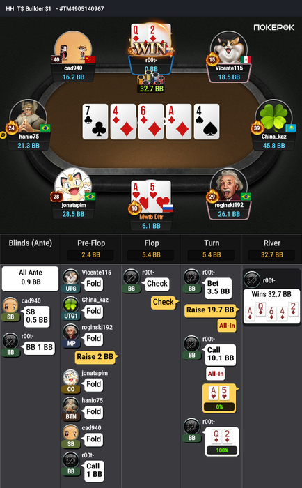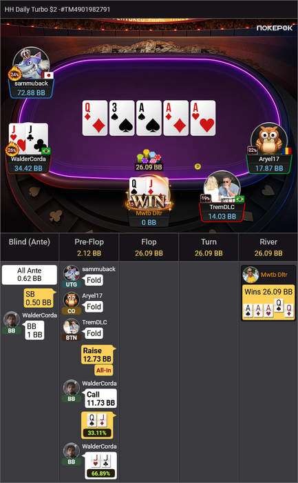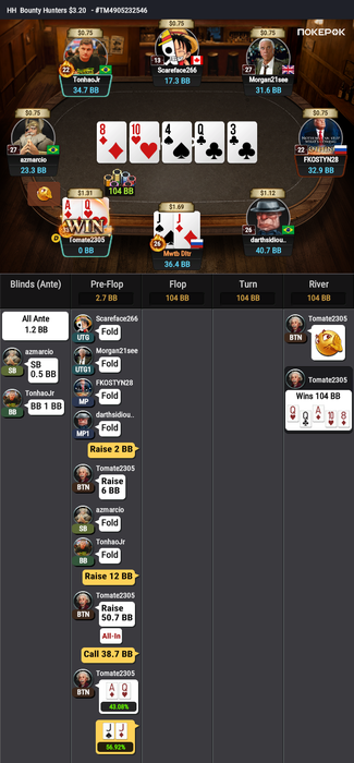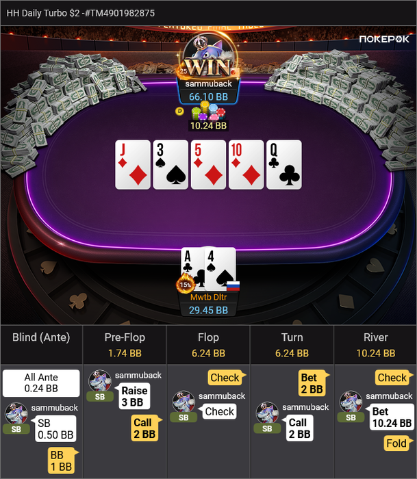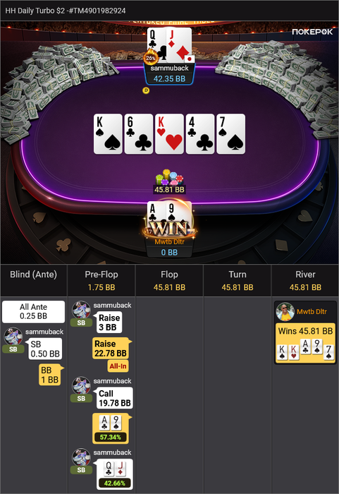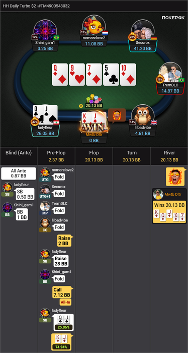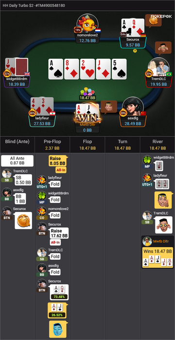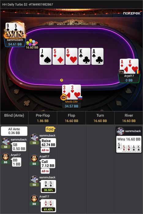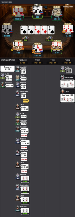 А на третий раз Покерок дал ему выиграть AQo>JJ.