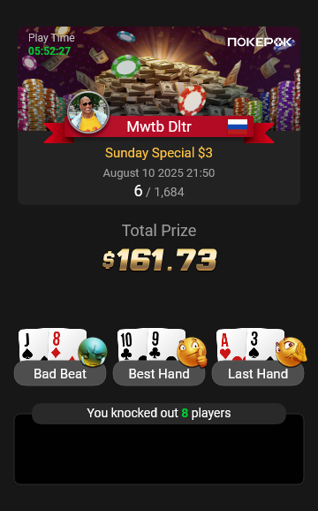 Недоволен финальным столом. Еще как назло пришла смс об угрозе БПЛА, и начал лагать интернет, постоянные зависания каждую минуту. Дичь, в общем. Но на безрыбье и рак рыба.
