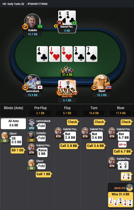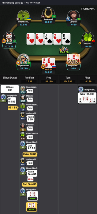 Раньше я часто заносил именно $1 билдеры, но то ли осторожнее стал в дипах, то ли структура поменялась, и к финалке средний стек в таких туриках становится 10-12bb. А там уже чистая лотерея с кучей отбитых коротышек. В этот раз я особо везением не отличился.