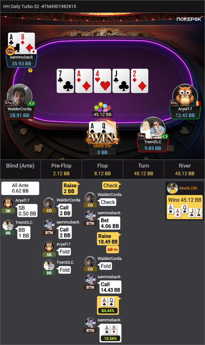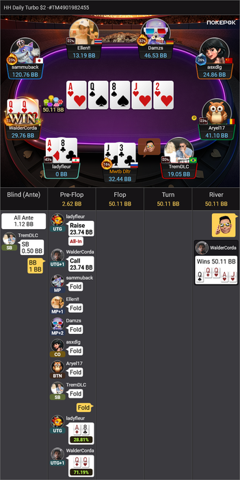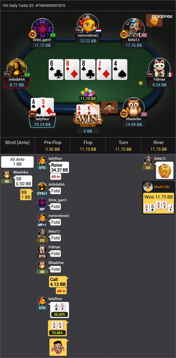 Потом наступил черед того самого японца, и он переиграл своего слабого туза против моих AQs.