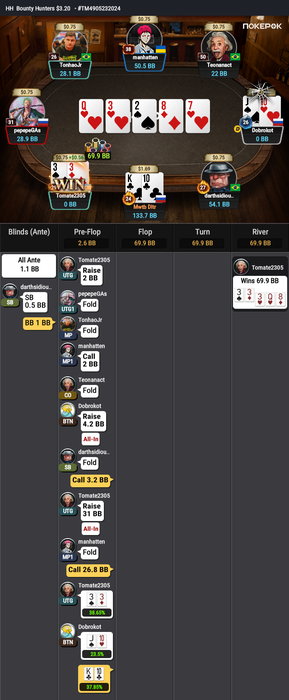 В следующей раздаче удвоивший меня коротыш запушил свои копейки, я колл, и в игру через сквиз-оллин 31bb влез альтернативно одаренный Tomato с карманными 33 и ушатал мои KTs (каюсь, широко кольнул, решив поиграть по правилам беспредельного покера).