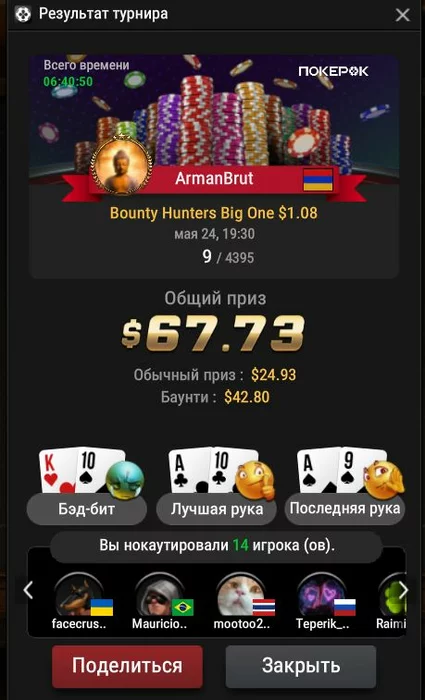 Набрал на бай-ин и сыграл турнир на 1,08$.