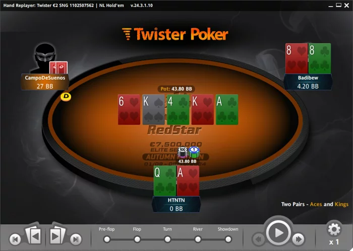 После этого я все лето играл двойки, чипев поднялось до 42-43, выбил за лето 2 главки на двойках и обе проиграл, раздачи уже не помню, значит ничего такого обидного, как на тройках не было) Переломный момент произошел в конце сентября, когда я наконец выиграл свою первую главку на двойках. Буквально на 2-3 раздачу было выставление AQo vs 88, с тузом на ривере) Ну и вот так я выиграл свою первую главку, эту шестерку треф на ривере помню до сих пор