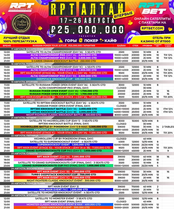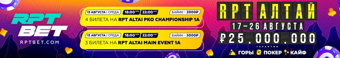 🏆 Заключительная порция путевок на серию RPT 17-26 августа на Алтае будет разыграна уже сегодня — на кону минимум ТРИ БИЛЕТА в RPT Main Event, а также минимум ЧЕТЫРЕ БИЛЕТА в Altai Championship PKO!