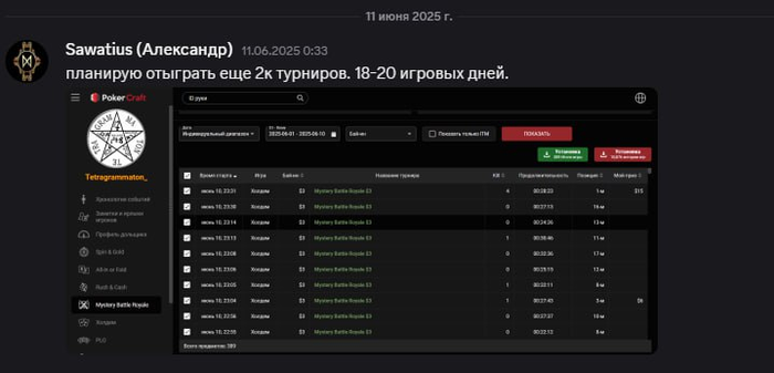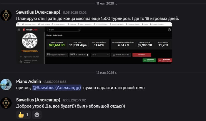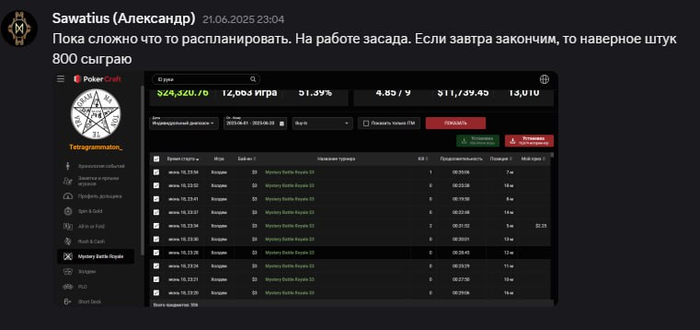 Далее Александр нас предупреждает, что у него засада на работе, но 1400 турниров обещает выкатать. (под спойлером ниже)