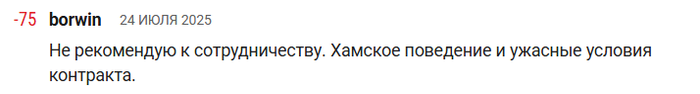 Syndrome, Если цепляться к каждой написанной букве, то с большой натяжкой можно рассмотреть. А то, что сталкиваешься с хамским поведением и не рекомендуешь к сотрудничеству, никак не мешает написать +, что и условия контракта скам. Читать то он давно умеет и тебе бы поучиться, а не писать миллионы букв напрасно) Да и вообще тебе ничего никто не ставил и не обращался, зачем ты все это строчишь....