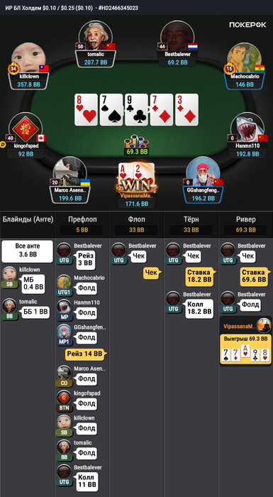 По обучению продолжаю обкатывать страту через овербет терн, уже неплохо так подразобрал споты. Есть понимание хотя бы в голове как солвер играет эти ситуации, по каким картам он овербетит, как играть ранауты которые сильно меняют доску например Q83J, как солвер выстраивает стратегию свою в таких спотах и что делать потом на ривере. Или когда 3 флеш приходит типа К82ssTs. Как играть терн и ривер, с какими частотами блефовать и что вообще блефовать и какими сайзами. Смотрю как на это все дело реагирует поле. Раньше играл по чуйке эти споты и не сказать что сильно где то ошибался или играл криво, но прогресс все равно виден. Как минимум я вижу точку равновесия и дальше уже в зависимости от предположений по игре оппонента могу выстроить стратегию либо с бОльшим количеством блефов, либо сильно меньше блефовать, а против кого то вообще убрать огромную часть блефов и чуть ли не тупо велью и лучшие блефы отыгрвать. Начал замечать как оппоненты ошибаются и не понимают как защиту выстраивать, начал это видеть и продумывать как я могу выстраивать эксплоиты вс конкретного оппонента. Есть ряд слабых китайских регов которые на овербет фолдят по ощущениям чуть ли не 90% ренджа терн, начал искать нулевые овербеты солверовские по терну без эквити, чтобы эксплоитить их оверфолд терна)