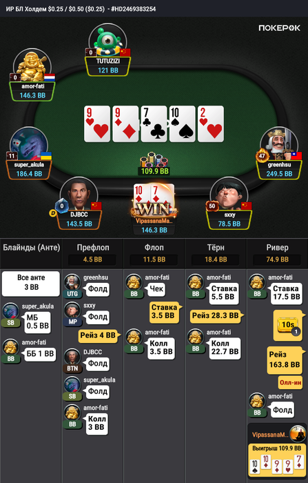 3) Постфлоп люди играют по сигналам из космоса. Часто проскакивают вообще непонятные колы, не то что за ренджами, а просто какая то рандом рука, потому что ну так захотелось. Когда я играл 6 макс нл50-100 нужно постараться чтобы рег что то там за ренджами исполнил, отколил лишнего. Там тебе копейки лишней тебе не отдадут, особенно на нл100) здесь же каждый день вижу какую то дичь, которую ни логикой ни солвером невозможно объяснить. В 6 максе за такое очень быстро начинают наказывать, в 9 максе из за того что постфлопа в целом меньше и такая ситуация возможно встретится только через 10-20к рук, не сильно влияет на итоговый винрейт