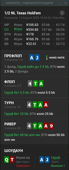 Короче, была уважительная причина не катать. Но я теперь профессионал. Сбил температуру, вытер сопли и откатал свою норму. Игры было мало, долго раскачивал в хедзапе парня типа 30/10. Полный стол ради такого играть никакого смысла, но в хедзапе катать с подобным персонажем очень комфортно. Показывал ему блефы в каждой руке, кидал бесячие эмодзи, короче делал все возможное. Ну и пацан не выдержал:
