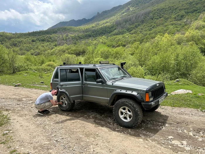 В Элисте Миша лезет поправить разъем омывателя и обращает внимание, что верхнего сайлентблока левого амортизатора просто нет. Выходит и амортизатор просто не работает. По трассе это не так критично, но дальше на бездорожье и грунтовках без одног аморта ехать не хотелось бы. Благо мы в городе, нашли магазин запчастей, купили какую-то резинку от Волги и тут же ее примастырили на шиномонтажке под советы невероятно пьяного мужичка, который то предлагал купить у нас чероки, то говорил, что у него уже 13 машин. Но с цифрами у него были проблемы. Ему самому было то 47 то 58 то 67 лет, и сидел он то ли 12 то ли 8 то ли 4, то ли лет, то ли дней.