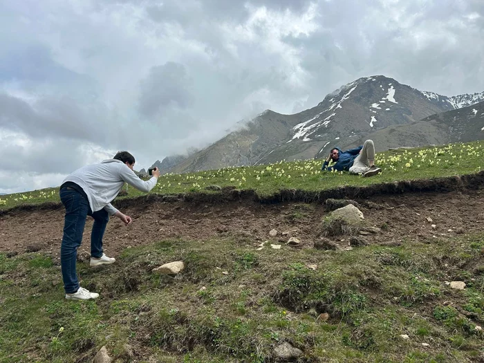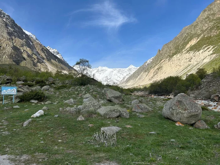 Спереди в облаках виднется Безенгийская стена. Мы решаем, что тут по кайфу, дальше никуда не поедем, остаемся в этом ущелье. Завтра идем в трекинг к этой стене.