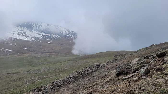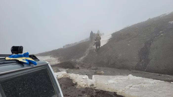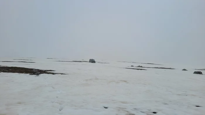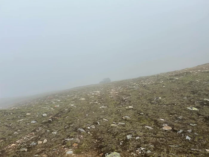 Навигатор показывает, что мы немного удаляясь от дороги держимся более-менее правильного направления. Я просто сижу за рулем и пытаюсь отключить мозг. даже назад мы не сможем вернуться по следам в таком тумане, местами выезжаем на камни, где колея теряется. Полнейшего сюра добавляют синдромы горной болезни)