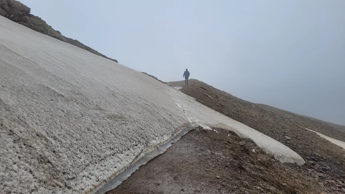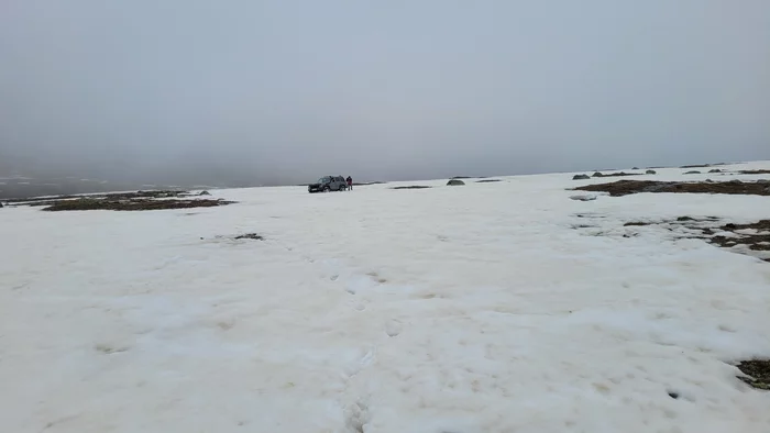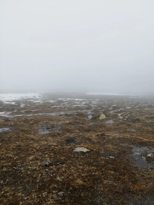 На видео Миша ушел на разведку, когда туман рассеялся и говорит, что дорогу мы потеряли, но по факту именно тогда мы дорогу и нашли. и увидели, что после реки, до которой осталось не так и далеко, снега как будто нет.
