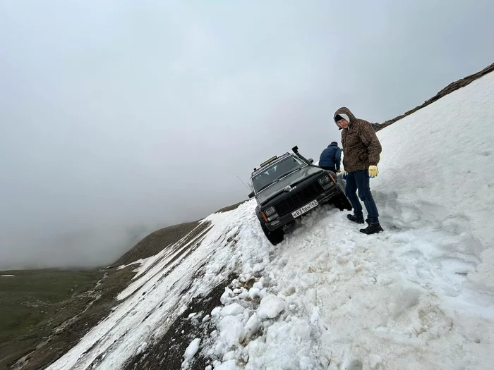 В очередном прогале облака отчетливо видим серпанин по склону горы, полностью заваленный снегом. Пробуем сунуться туда, но понимаем, что если это и возможно, то проезд там займет очень много времени. так же есть другая дорога в примерно правильном направлении, она идет траверсом по другому склону, участок ее тоже переметен, но такое мы уже проходили ранее. Достается лопата и прокапывается траншея под верхние колеса - вот и все решение.