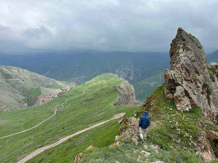 Помимо языка тролля тут же присутствует развалина какой-то древней башни, коих на Кавказе бесчисленное множество. А снизу слева петляет дорожка к другой достопримечательности - качелям.