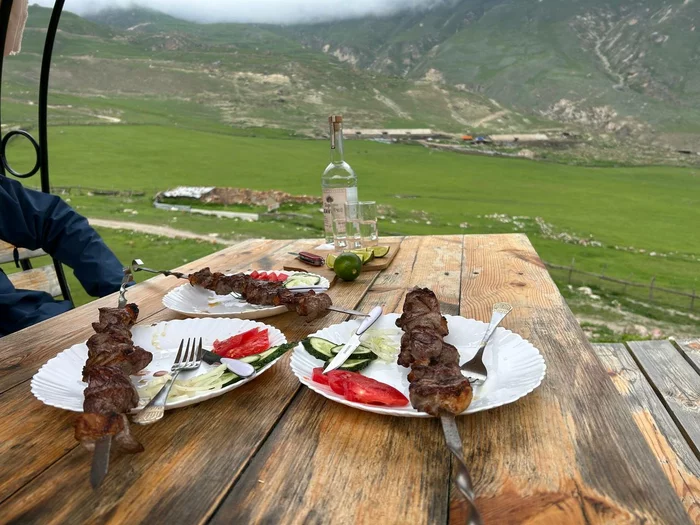 У них нет макзавтрака! - доходит до нас утром. Свинина тут не в почете. Приходится брать бургеры из обычного меню, с собой берем стрипсы. Они хороши даже в холодном виде. Выезжаем в сторону села Верхняя Балкария. именно оттуда начинается дорога на перевал в сторону Безенги. Пока что мы не знаем, проходим ли этот перевал вообще, сколько времени это может занять. Мы готовы к любым вариантам, хоть к ночевке в палатках. В конце ущелья безенги есть Альплагерь, думаем, если хватит времени, ехать ночевать туда, после же сходить в трекинг.