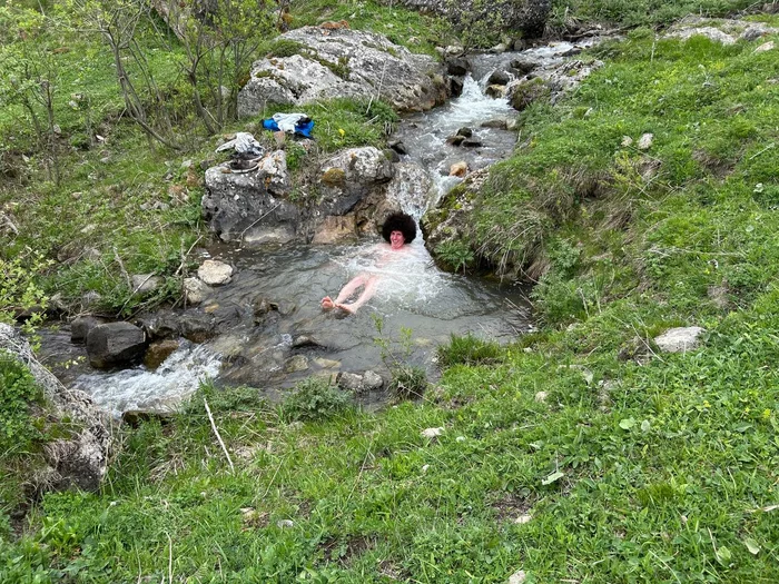 Прямо под камнем речка, в которой стоял наш Чероки, образовывала идеальный бассейн. Водичка холодная градусов 7-9, но кого это когда останавливало? лезем!
