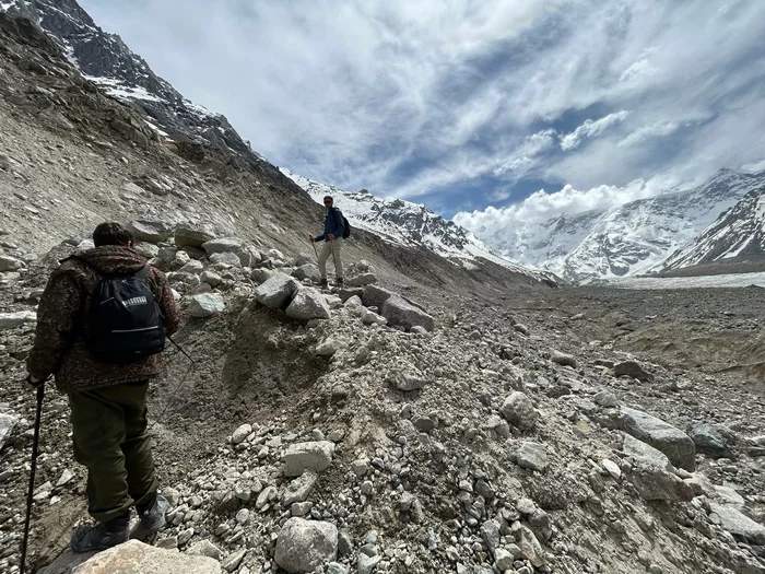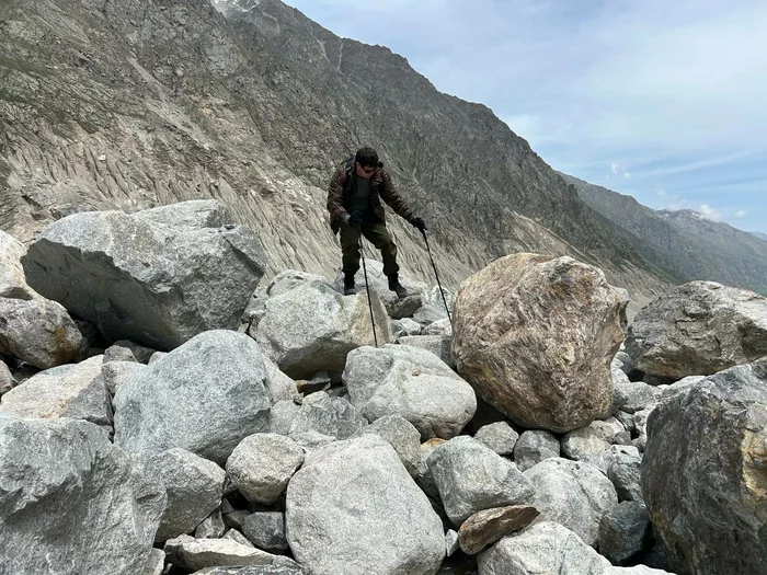 Вот тут и закончился наш поход. Мы не дошли до озера Баран-кош, которое считается концом трекинга, оно где-то по ту сторону ущелья, но дороги туда мы просто не нашли. Ледник это не просто поле с камнями, он повсюду изрезан трещинами разной глубины и ширины, идти неподготовленному человеку невероятно сложно.