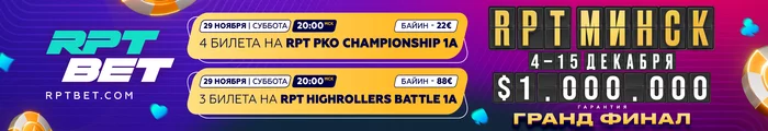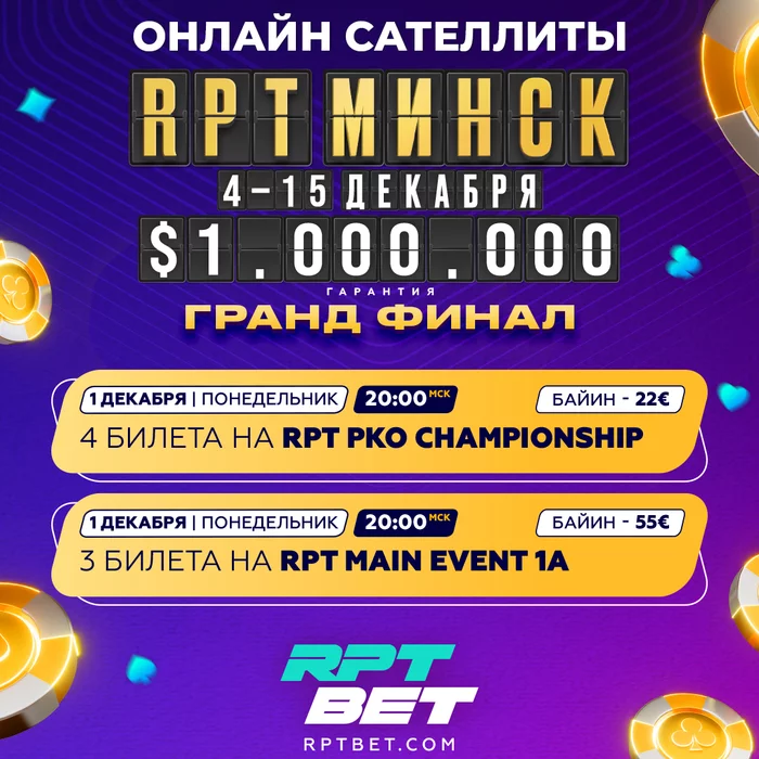 🚀🚀 Более $4,000 билетами в турниры Гранд Финала RPT 4-15 декабря в Минске разыграем сегодня в онлайн-сателлитах на RPTBET — на кону минимум ТРИ БИЛЕТА в турнир Хайроллеров, а также минимум ЧЕТЫРЕ БИЛЕТА в турнир Belarus PKO Championship!