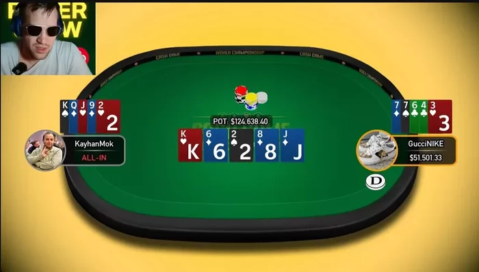 – Кайхан точно не выбросит флеш от дамы. Пытаюсь понять, какие блефы есть у Gucci. Неверное, что-то с голым . Вряд ли он будет ставить три барреля с сетом. Допускаю, что у него вообще не блеф, а К-хай флеш с карманными королями.