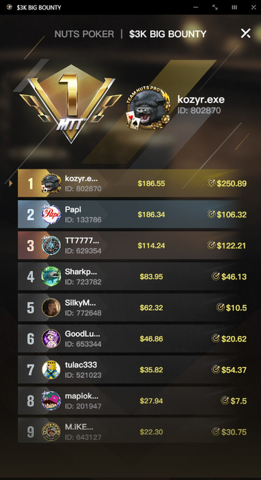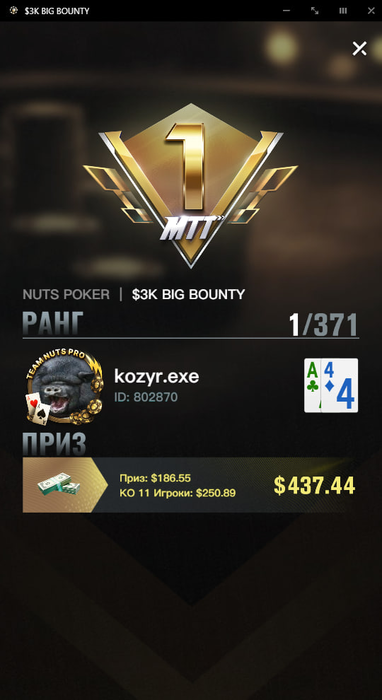 В общем, речь о том, что я (прожженный кэшевик) наконец-то доехал до 1-го места в МТТ. Не так давно решил по приколу, да и для разнообразия на стриме, подмешивать турниры в свою загрузку. Особенным шиком и блеском моя игра в них не отличается, но будучи приверженцем задротства во всём, чем занимаюсь, со временем задумал чуть повнимательнее изучить префлоп турнирной среды. Изучением, стоит добавить, всё ещё занимаюсь (не торопясь, в охотку). Одних чартов мне не хватает, потому как хотелось бы постичь саму логику принятия решений в зависимости от стадии, размеров стека и бла-бла. Все эти широкие колд-коллы, пуш-фолды, ICM стадии... Ужас, если честно. Но в стеках 45-50бб (и выше), на самом деле, вполне комфортно себя чувствую на постфлопе. Именно это, как мне показалось, и помогло приехать первым. Если не считать пару-тройку чудовищных переездов своих оппонентов в важных выставлениях. Короче, надо бы уже похвастать скрином с пруфом😎
