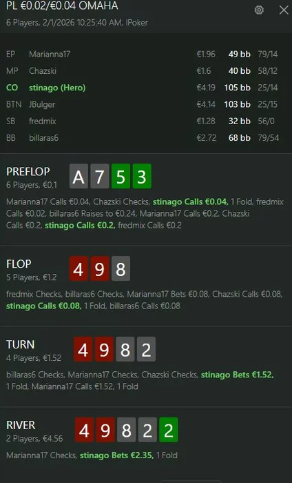 Gostina @ 28.01.26Doctor_Joint, еп рейз 3бб, остальные все колл, я подкинул за всеми на сб (Артем блять хватит так делать). Донкать на флопе не стал, все чек, на терне поставил потбет, все отвалились, кроме одного. На ривере поставил потбет, получил рейз в олин