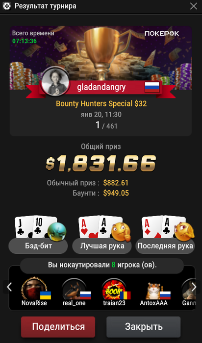 Дисперсия никуда не исчезает, но перестаёт переживаться как определяющая сила. Победа ощущается как вопрос качества присутствия и скилла. Появляется ответственность за результат. Не важно, сколько раз должен прийти сет, если ты в итоге выигрываешь этот турнир. Иногда он может прийти и пять раз подряд.