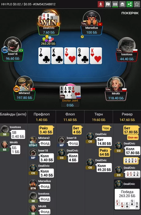 Doctor_Joint @ 18.02.26Возможно. Я играю рег столы, поэтому чекал я на терне против конкретно этого товарища, чтобы играть чек-рейзом. Потому что он всегда ставил много в любые чеки с любой рукой. Но это не значит, что я прав =) Я по оппонентам стараюсь играть такие ситуации. По поводу ставки на флопе не знаю - может и чекнуть надо было.