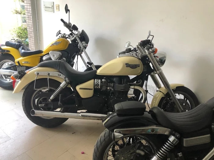 Тут сложно сказать, что пошло не так. То-ли вьеты действительно перепутали, то-ли забили болт, то-ли оба варианта сразу...в общем, как мы говорим в подобных ситуациях - "случился Вьетнам". Но в любом случае надо было сложившуюся ситуацию разруливать. В итоге садимся с Ником на один мот, пишем вьетам и едем на место. На точке действительно стоит что-то вроде автовоза, только для мототранспорта. Нам спускают мотоцикл, дают ключи с доками и уезжают в закат. При близком осмотре мотик был еще более уставший, чем на фотках. И это пока только внешне. Видно, что долго где-то стоял и пылился. По тех части - загадка. В ту ночь нам очень повезло, что он вообще завёлся и поехал - смогли домой в гараж отогнать. На следующий день при свете и небольшом тех чек апе уже стало понятно, что методом "немножко подшаманить" тут не обойдётся и 300$ это, скорее всего, самый минимум, который придётся вложить. Но тут ещё тот факт, что мой друг в этом плане жуткий перфекционист. Пока у него техника не доведена до идеального технического и внешнего состояния - он не успокоится и ездить не будет. Короче, Триумф тоже привели в порядок, перекрасили, и он стал даже весьма себе красивым английским мотоциклом. Нашёл фотку, где он как раз после всех манипуляций в середине стоит. На заднем плане мой Стид, а на переднем кусок Харлея =)