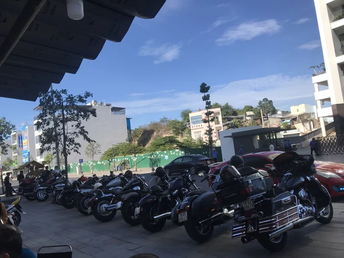 По омахе пока всё, продолджим про мотоциклы. После того, как я пересел на Триумф, через какое-то время я поехал на местную тусовку. В Нячанге начали проводить "Bike week", но первый раз по сути это был так называемый "Test ride day". Компании Triumph и Harley Davidson привозили мотоциклы для промо в Нячанг, чтобы потециальные клиенты могли прокатиться и сделать покупку. Ну и под это дело собиралась местная и не очень мототусовка. Проходило это мероприятие в центре города, в месте под названием Palms Bistro. Если кто был там, могли заметить выставленную ретро технику в зале. Владелец большой фанат ретро и особенно старых БМВ и Весп. С утра часов до четырёх всё шло в таком формате, а потом все шли куда-нибудь пить пиво. Выглядело это примерно так
