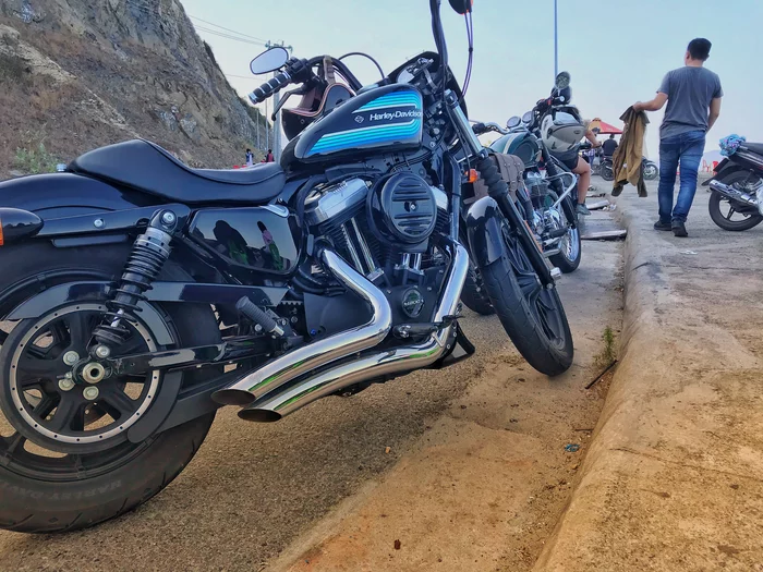 Это я сижу на парапете, который попутно ещё явлеятся столом. Местно довольно популярное у местной молодежи, чтобы попить кофе с видом на море. И вот как-то в один из дней на этом месте рядом со мной запарковались два мотоцикла - почти такой же Триумф как у меня и Харлей.