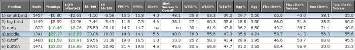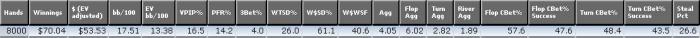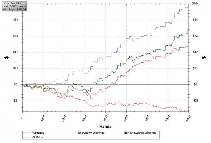 Сегодня был лучший игровой день за все время NL5. Стал меньше контбетить ( 58%), против 73% что были раньше , и по этому поводу чувствую себя отлично. Видимо поэтому вырос показатель WTSD%. Почему то вырос Turn c-bet success, в результате W$WSF не только не упал ( как должно было произойти после уменьшения частоты контбета ), но и немного вырос. Красная линия non-showdown winnings выглядит просто идеально по сравнению с тем, как она выглядела раньше. Причина тому - хороший винрейт на блайндах. Ничего особенного я не делал, просто, видимо, на блайндах зашли руки, которые были хорошо оплачены. Неплохой такой апстрик. В целом, выводы по 8 к рук делать нельзя, но пока мне очень нравится это уменьшение частоты контбета, играть стало комфортнее.