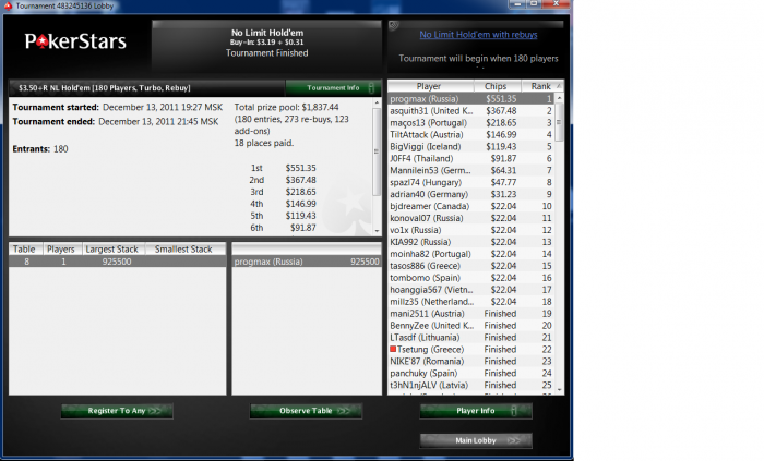 Первый раз, наверное, за несколько месяцем могу выказать респект и уважуху PS. К 1-ому и 2-ому месту в ребайнике по 3.5, удалось получить путевку на турнир,топ-3 которого, способен кардинально изменить мою жизнь. Всем удачи в воскресенье. Увидимся на финалке