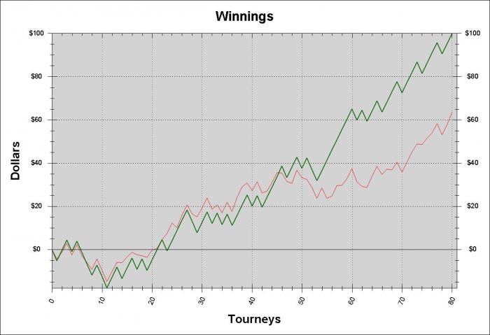 После последней лудоманской выходки прошло всего ничего, а у меня изменилось многое. Хотя эта игра и была минусовой в финансовом плане (деньги - дело наживное), в плане опыта она была очень выгодной. Так что от части я даже доволен этим. Посмотрел графики игр по лимитам... На 2,15$ у меня минусовой РОИ!!! большей частью это из-за постоянной игры на двух столах, но и играют там больше фофан поэтому читать людей намного сложнее. Поднимался там только за счет shootout'ов. А на 5,25$ график более чем нравиться, хотя и с перебором (РОИ за 80 игр 23,8%):