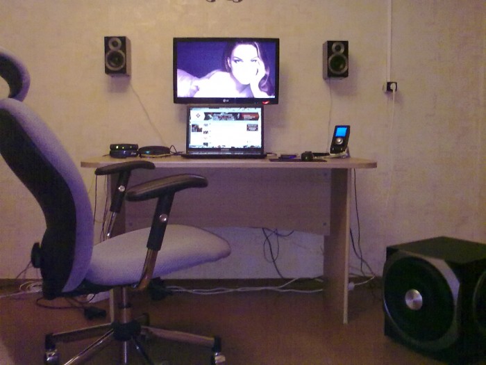 да выглядить красиво как в офисе, лично я играю на мягком кресле и ноут просто на колени кладу, так удобней ) иногда могу ноут поставить на стол и нажимать кнопки мышкой...