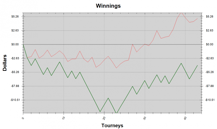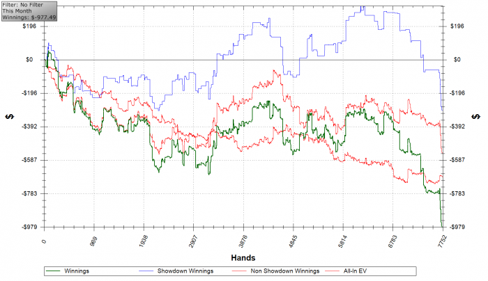 Между тем разрыв с ЕВ сокращается со стремительной скоростью, даже обидно немного, т.к. получал я его, когда фиш 2% натягивал, а уходит разница на ситуациях, когда вроде неплохо выставляюсь против диапазона, но в итоге оказыюсь андердогом и в итоге мне доезжает. Хотя наверное глупо жаловаться