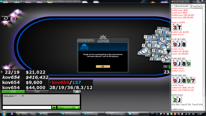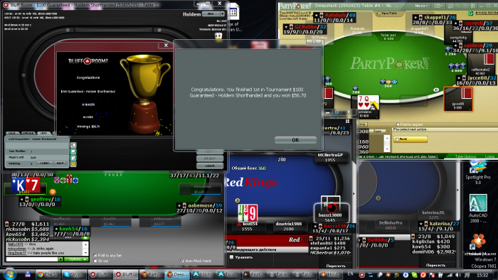 Давненько ничего не выигрывалось. Я даже не знаю, что может быть этому виной. То ли нескончаемые праздники друзей, в которые не удавалось играть в покер, то ли нескончаемые праздники, которые безо всякого повода устраивал себе сам. Вчера, вот, было жалкое 8е место во фризе на пати по 5. Сегодня сыграл 2 сессии: - в утренней обижали. Сдавали кулера не в мою пользу и везде вылетел без итм. - вечерняя не задалась сначала - отдавал и отдавал. Остался дип в моем любимом 1.8+0.2 на лотосе. Достаточно долго катали 3 макс, но, я все-же выбил агрессивного хорошего опа. В ха попался достаточно нитовый прямолинейный оп. Вышли со стеками 450/350. Воообще, мне оч хорошо заходило, и я быстро довел свое преимущество 600/200. Игрой своей доволен - удалось довести опа до кипения, и в финальной раздаче он принял неверное решение. +180уе