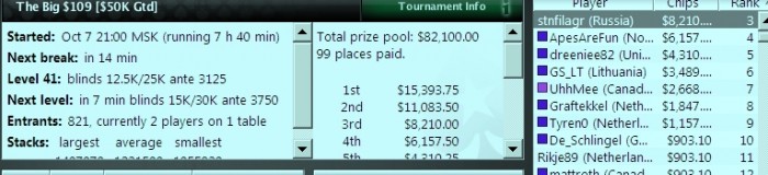 запустил клиент в 9 уже порядочно уставшим , купил билет на 109$биг(21:00МСК) примерно к 11:20 шел большим чип лидером с 60к стеком и так до перерыва, после перерыва в 00:30 продолжил со стеком чуть больше среднего, спасибо другу позвонившему и разбудившему меня, далее до финалки играл без лишних движений, в топ10 шел на 1м, но конец предфиналки и начало 9мах отыграл плохо, откатившись на 8е место, потом удвоился, доигрались до 3мах...в 3мах парни не договорились о сделке, продолжили играть...в итоге QJs<A8 3е место и рекордный для меня приз 8210$