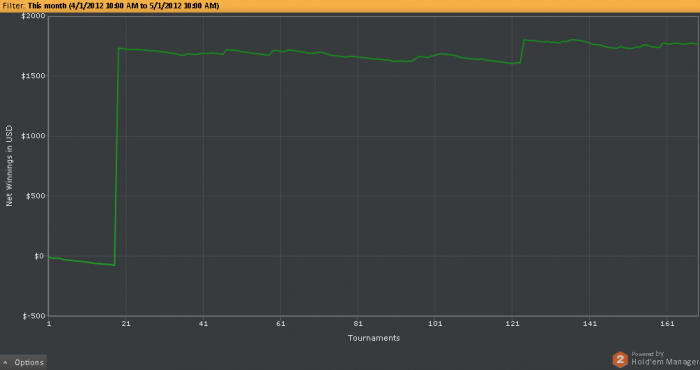 Откатал на этой неделе 102 турнира, мог больше, но опять были проблемы с интернетом. Сегодня сессия получилась плюсовой, но самой обидной. Во всех килополянах прошёл очень далеко, повылетал в топ 100-200, вышел на финалку в 5.5 1000сар, вылетел шестым. Фиш вколил два банка по флопу с флешдро и переехал моих тузов. в итоге только отбил минус за неделю. всего вроде +25 баксов с момента последнего заноса. И ещё выкинул в одной раздаче фулл-хаус на ривере. Если найду её выложу.