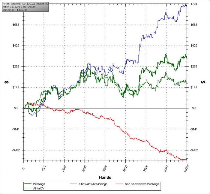 Ну вижу хоть не многочисленые, но читатели есть) Марафон особо не получился, и можно сказать он закончился... Но бравое дело наконец то начать зарабатывать кэшем(побить омаху) осталось, так что буду продолжать прогрессировать, выкладывать раздачи, иногда мысли... Читаю потихоньку литературу, правда читать уже практически нечего, просто перечитываю ибо после перечитывания остается в голове на порядок больше, чем после первого ознакомления))) В общем попросил Модераторов переименовать топ, буду дальше тут писать... Достиг отметки 10к рук... вроде неплохо, но пугает ев линия, надо бы ее вверх поднимать)