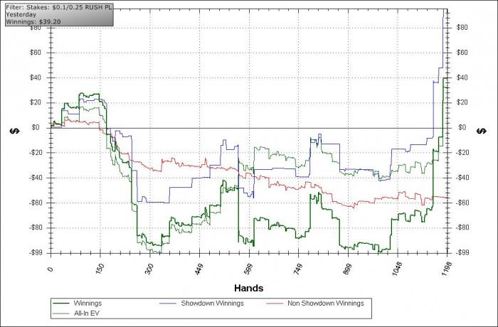 Ну раз читатели все таки присутствуют и писанина вся моя не пропадает, буду стараться отчитываться почаще... В общем работать мне еще и работать над собой, причем даже на данный момент не столько над технической частью, сколько за ммм рабочим состоянием души... В принципе сейчас стараюсь играть очень суженый диапозон префлоп карт, сижу спокойно фолжу фолжу, то что раньше считал более менее картой, практически перестал играть на сет в общем играю как мне кажется нормально... Потом бах по чайнику в один момент и пошло безобразие форменое, какие то необьяснимые лимпы, райзы, рерайзы... Смотрю на один стол, переключаюсь на второй, а я там на батоне уже смотрю флоп против блайндов с каким нить калом типа 66ТК, а как я туда попал не помню)... Это при том что дал себе установку с батона против блайндов парами не играть(я имею ввиду средними), от сета все равно пользы никакой, а постфлоп блины играют как то лузово в раше... Потом кое как собираю себя в кулак и начинаю отыгрывать все что проеп... Качели жесткие, причем не потому что омаха качели, а потому что так играю, то собрано, направлено, то как лудоман...