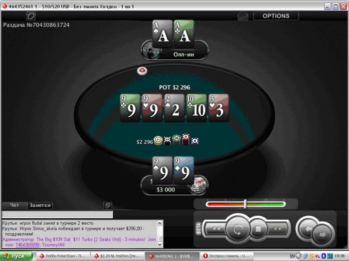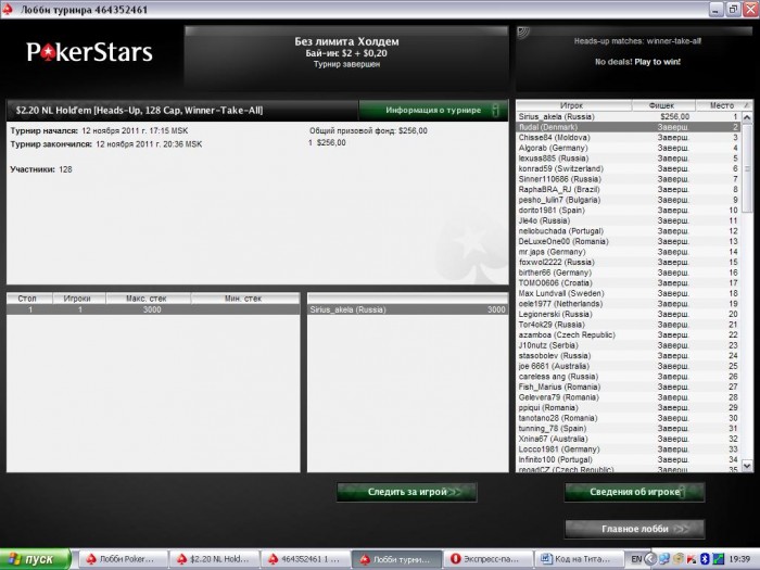 Всем привет Решил сегодня устроить день MTT, дабы немного отдохнуть от ХА'пов. В регулярных 9-6-max не задалось, зато в 2.20 Heads-up 128 Cap доехал Паралельно играл 4-5 МТТшек 9-6-max. На этот турнир особого внимания не обращал, т.к "ну не реально ж до 1-ого места добраться!". Первые 4 раунда отыграл на автомате, особо не запариваясь. После 5-ого заинтересовася: А вдруг?!! Ну и сообственно, уже играю финалку Сыграл с оппом раздач 12, оторвался от него по фишкам немного. Открываю Оперу, чтоб пробить его по ProLabs... Краем глаза вижу сдали . 3-бечу и получаю мгновенный мелкий 4-бет... Не хотелось сбрасывать, а тем более колить.. Надеясь что там AK, учитывая отрыв по фишкам, фолдэквити или что он просто псих с 52o, поставил лудоманский 5-бет олл-ин . Что я вижу: