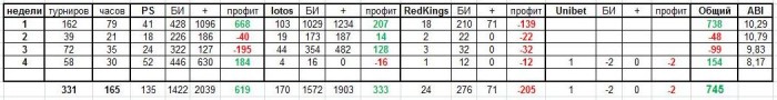 Решил с этой недели поднять средний ABI. А то вроде профит в плюс идет, а я на месте стою. Подключу несколько новых турниров, типа 5+r, 8+1r+1a, 11+1r+1a. Как-то мне больше такие турниры нравятся, чем биги по 16,5$, 22$, 33$. Там что-то очень уж килополя выходят дисперсионные. И кол-во столов буду постепенно увеличивать. В январе в среднем играл на шести. Февраль постараюсь по 7 грузить, и далее по одному дополнительному столу в месяц.